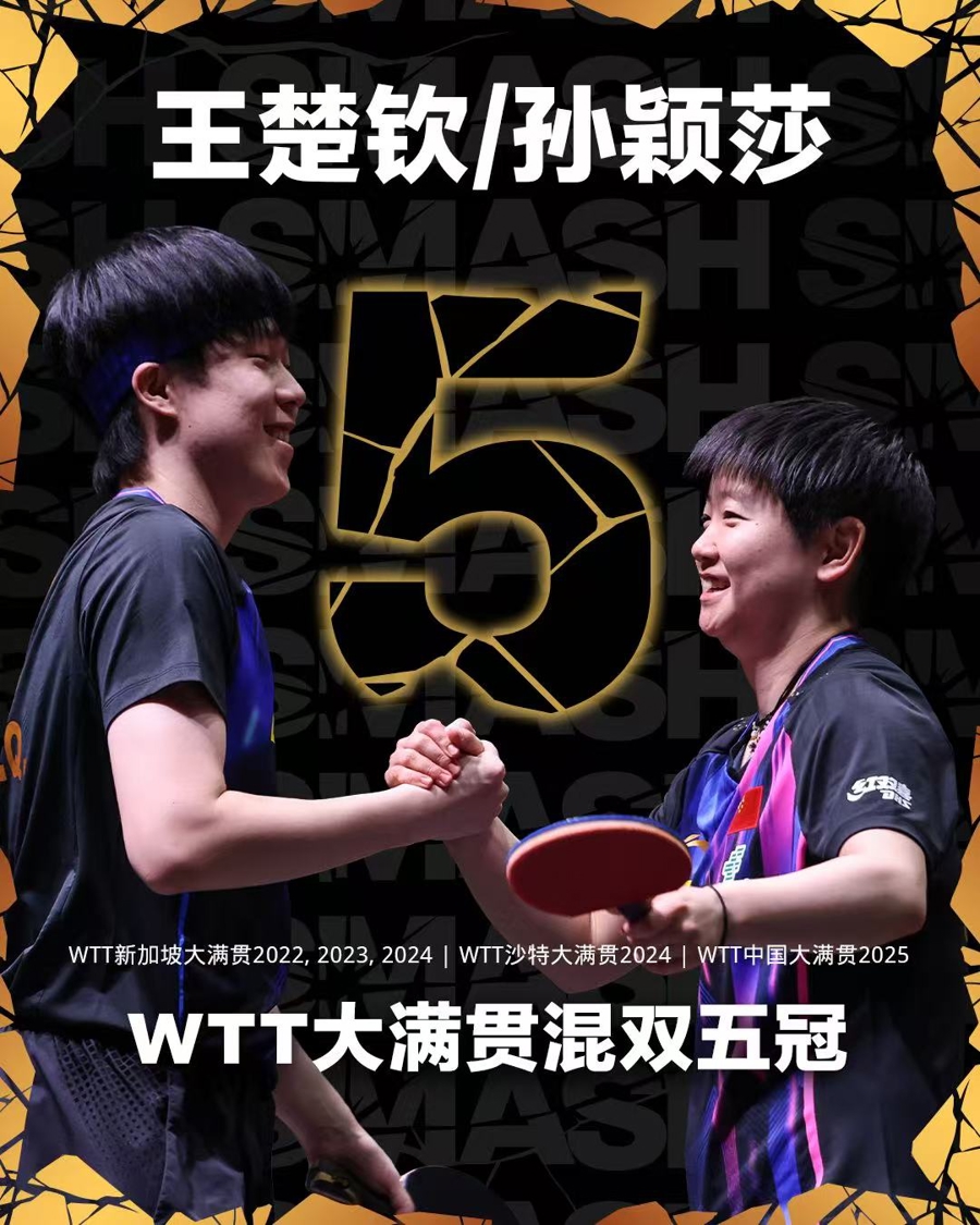 10月3日,WTT中国大满贯赛迎来首个冠军归属时刻。在混双决赛中,“莎头组合” 王楚钦/孙颖莎展现出强大的实力与绝佳的配合,以3比0的战胜队友黄友政/陈熠,成功斩获本次赛事混双冠军。这也是两人职业生涯中第五次捧起 WTT大满贯赛混双冠军奖杯,再次印证了他们在混双项目上的统治力。