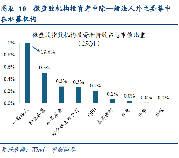 小微盘股东结构中个人投资者占比更高,居民超储释放,散户是主要增量资金,小微盘或更为受益。从股东结构来看,基于25年上市公司一季报披露的前十大股东持股数据,通过整体法统计各类股东的持股市值占总市值比例。微盘股股东以个人为主,截至25Q1,微盘股指数持股最高的为境内自然人,占比30%,显著高于排名第二的境内非国有法人15%(产业资本或机构投资者),同为小盘代表的国证2000大股东持股最高的同样为境内自然人16%。相比之下,全A大股东中持股最高的为国有法人25%,境内自然人占比仅8%,沪深300仅3%,基金重仓股4%。股东结构决定了散户主导的资金行情中,小微盘更加受益,今年以来微盘股指数净流入资金中,小单净流入275亿元,中单、大单分别净流出103、307亿元,超大单净流入136亿元。其中超大单流入或主要来自一般法人的增持和私募基金,基于基金持仓披露和上市公司季报中的股东数据,25Q1微盘股机构投资者持股占比21%,其中一般法人19.6%,阳光私募0.5%,公募基金0.3%,基于可比口径计算24Q3-25Q1半年间机构净买入规模,一般法人+38亿,阳光私募+6.8亿,公募基金+4.9亿。展望后市,随着居民部门超储释放,股市成为主要承接,散户资金或进一步加速入场,个人投资者占比更高的小微盘有望持续受益。