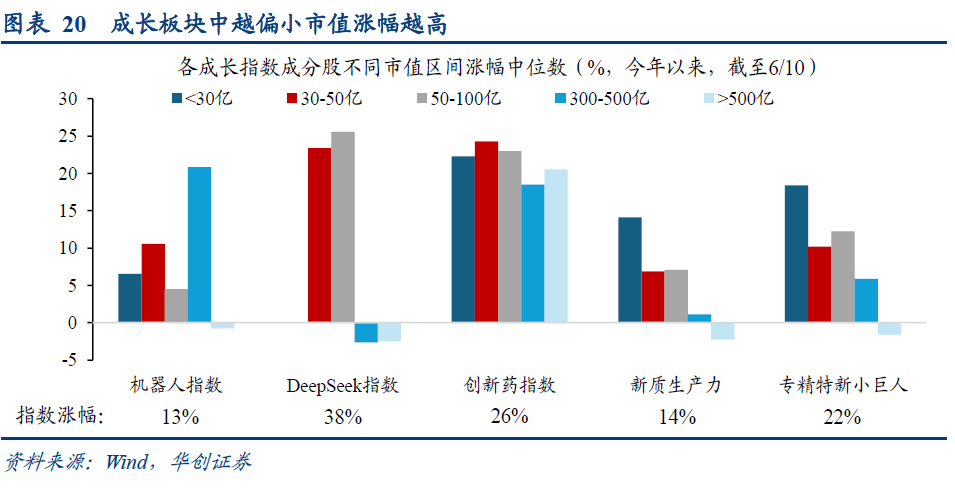 北交所涨停限制30%,双创20%,相比主板10%,在流动性助推的小微盘行情中优势更大。从交易机制来看,北交所和双创凭借更高的涨停限制,相比主板表现出更大的弹性。微盘股指数成分股不含北证,主板占比接近50%,创业板30%左右,科创板20%左右。从涨幅表现来看,双创明显高于主板的成分股,从微盘股指数每次调整成份股(月频)的区间涨跌幅均值来看,创业板8.1%,科创板9%,均显著高于主板的6.5%。从今年以来表现亮眼的成长主题来看,北证、双创的公司同样显著跑赢主板(图表21),且呈现出市值越小涨幅越高的趋势(图表20)。典型如机器人指数今年以来涨幅13%,其成分股中创业板涨幅中位数13%,科创板17%,北交所6.5%,均显著高于主板的4%。