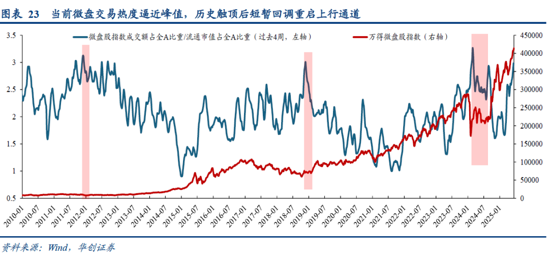 交易热度:当前微盘股交易热度逼近历史高点,成交触顶或短暂回调,历史经验回调持续3-6个月,幅度20%左右。微盘强势表现的背后是交易热度的快速提升,以“成交额占全A比重/流通市值占全A比重”来衡量交易热度,当前微盘股指数达到2.98,接近历史最高的3.3(24年3月),处2010年以来98%分位。历史上看交易热度触顶后,微盘股通常出现短暂回调盘整,最大回撤幅度20%左右,持续时间3-6个月。典型如2024年3月初,微盘股指数成交热度触及历史峰值3.3,之后回调盘整,24/3-24/6微盘股指数下跌-8%,最大回撤-24%,同期万得全A -1.1%,最大回撤-7%,之后微盘股相对走强,直到924国新办会议后受政策催化重启上行通道。